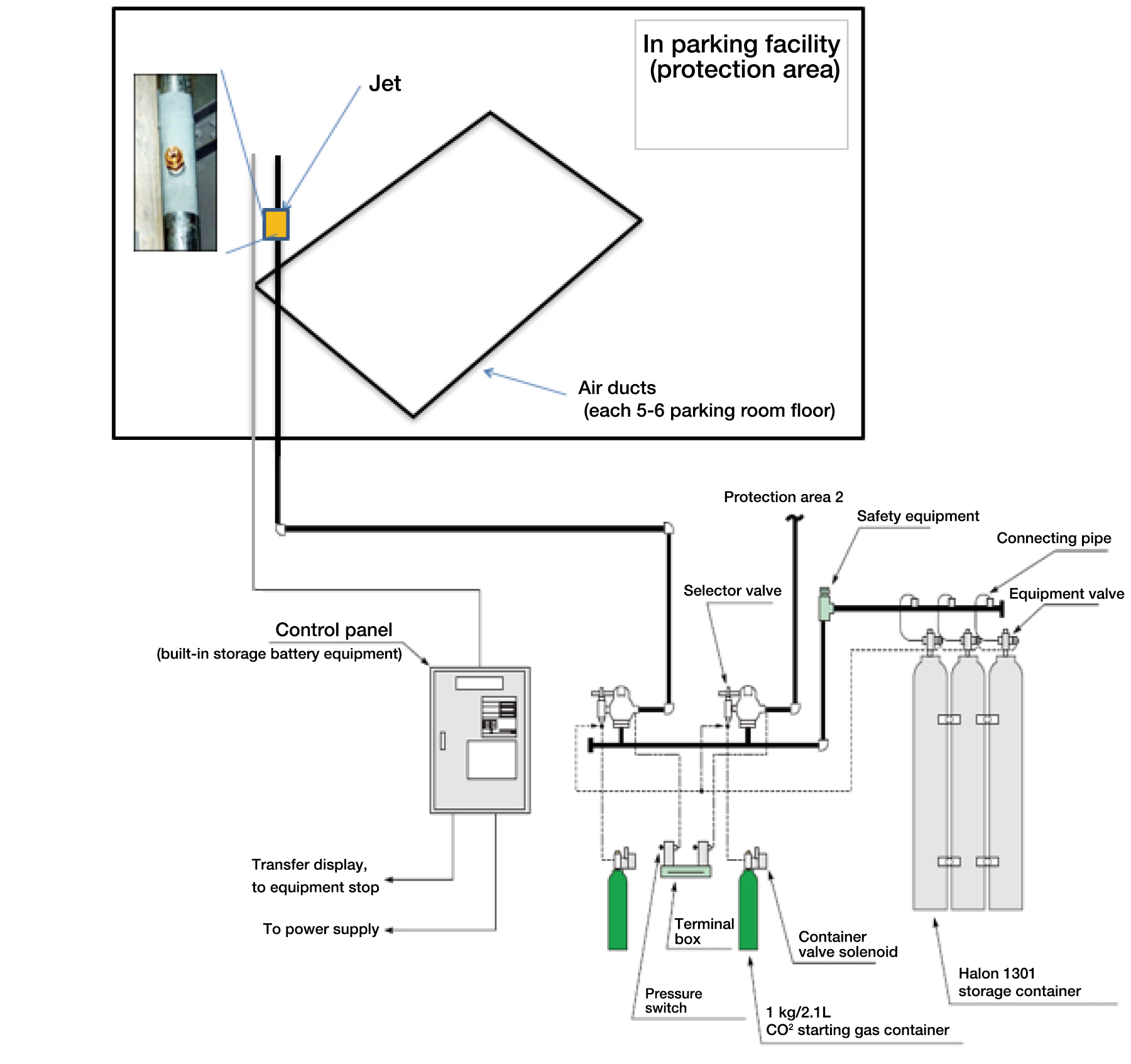 In new construction of parking facilities, JFE Technos provides guidance on the optimum gas fire-fighting equipment and type of inert gas to be used (CO2, Halon 1301, etc.), the number of units, and the necessary spatial dimensions for the capacity of the customer’s car parking facility.