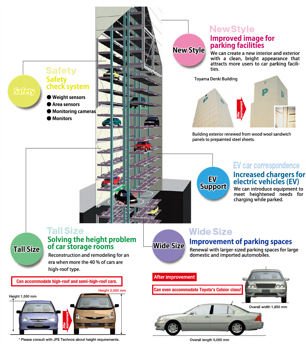 With changing times, the types of automobiles that use parking facilities have also changed greatly. JFE Technos can propose renewal plans to create parking facilities suitable for family cars, RVs, high-roof cars and EVs.