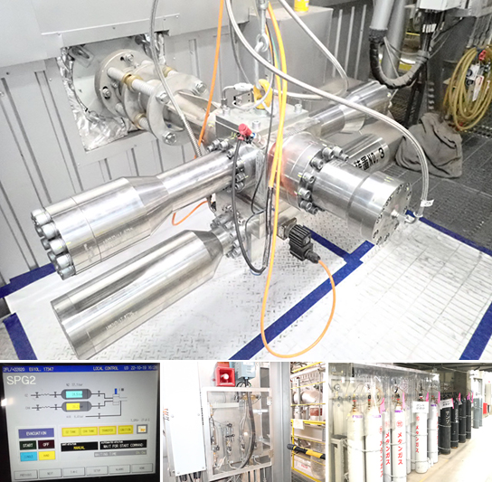 装置本体(上)、運転制御(下左)、メタン・酸素・窒素ボンベ(下中)、バルブパネル(下右)