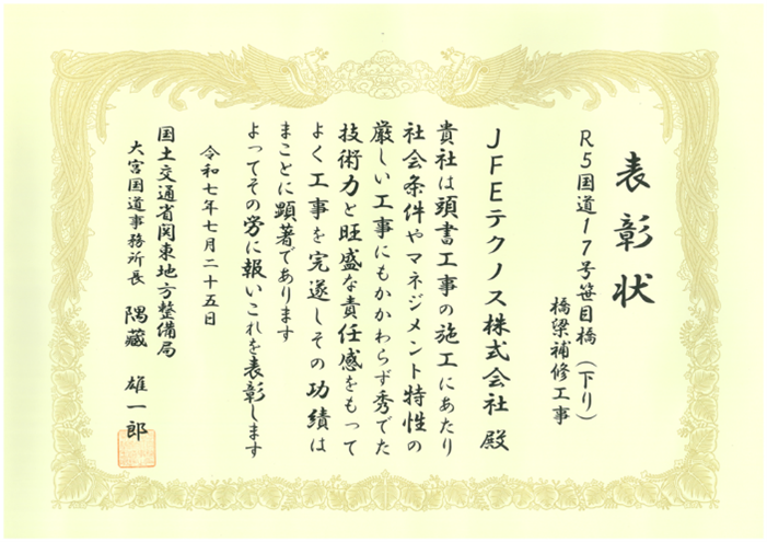 当社施工「R5国道17号笹目橋(下り)橋梁補修工事」において 国土交通省 大宮国道事務所から難工事功労表彰を受賞しました。 今後も安全第一で工事に挑んでいきます。